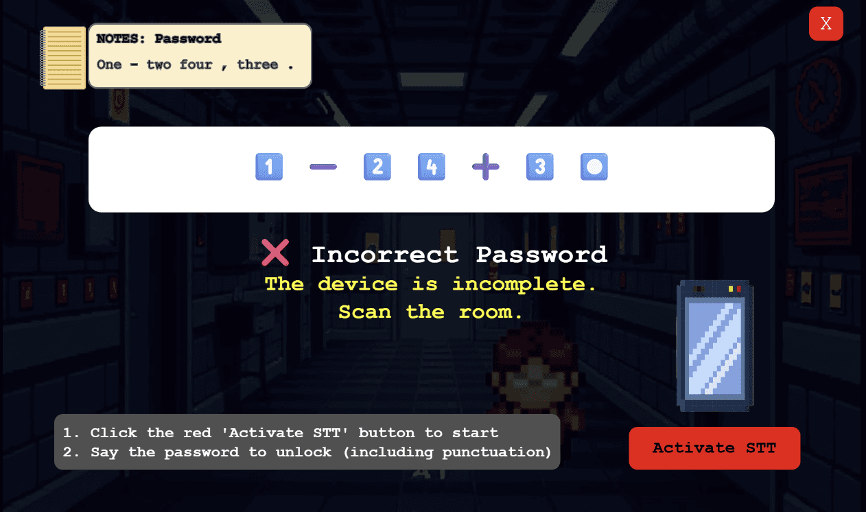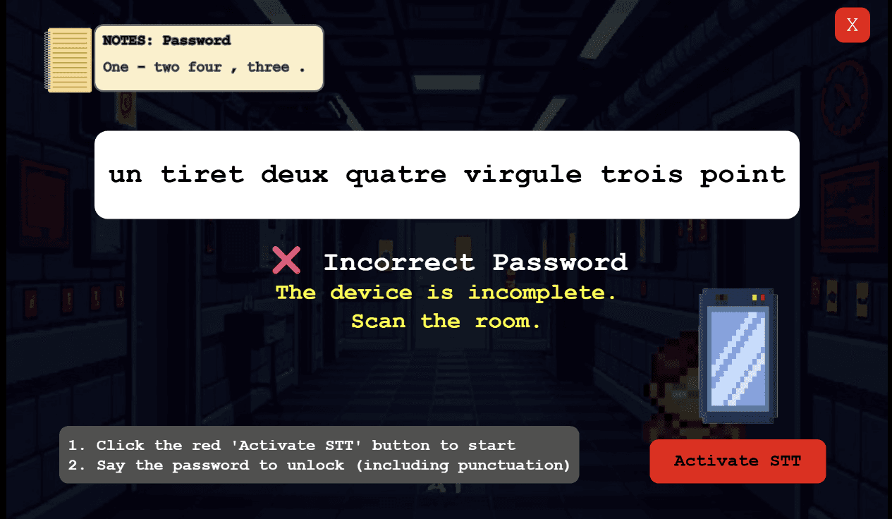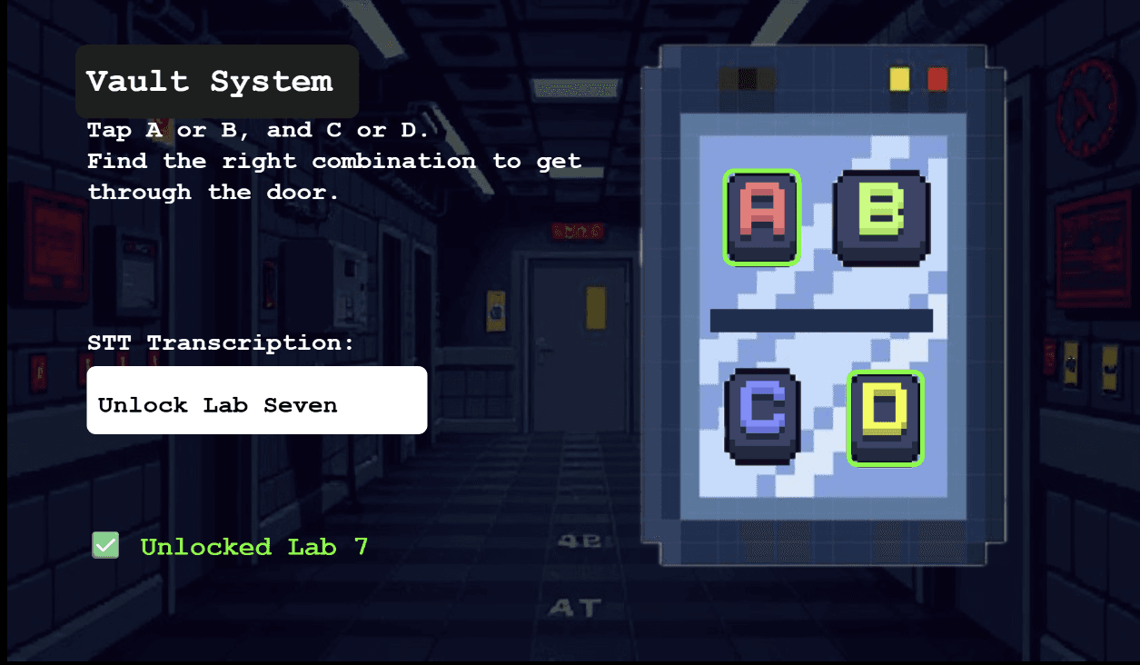 Testers wanted to better understand how settings impact STT accuracy → We added a voice lock puzzle where players calibrate mic sensitivity and dialect mode.