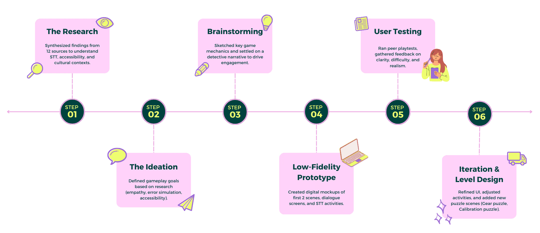 After going through several rounds of research, brainstorming, prototyping, and iteration, our team arrived at a low-fidelity game that simulated the experience of relying on speech-to-text (STT) technology. Below is an overview of the final scenes and the key user experience goals behind each one.