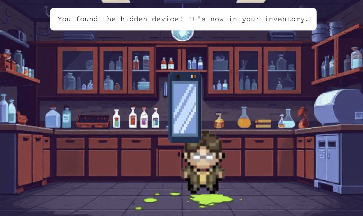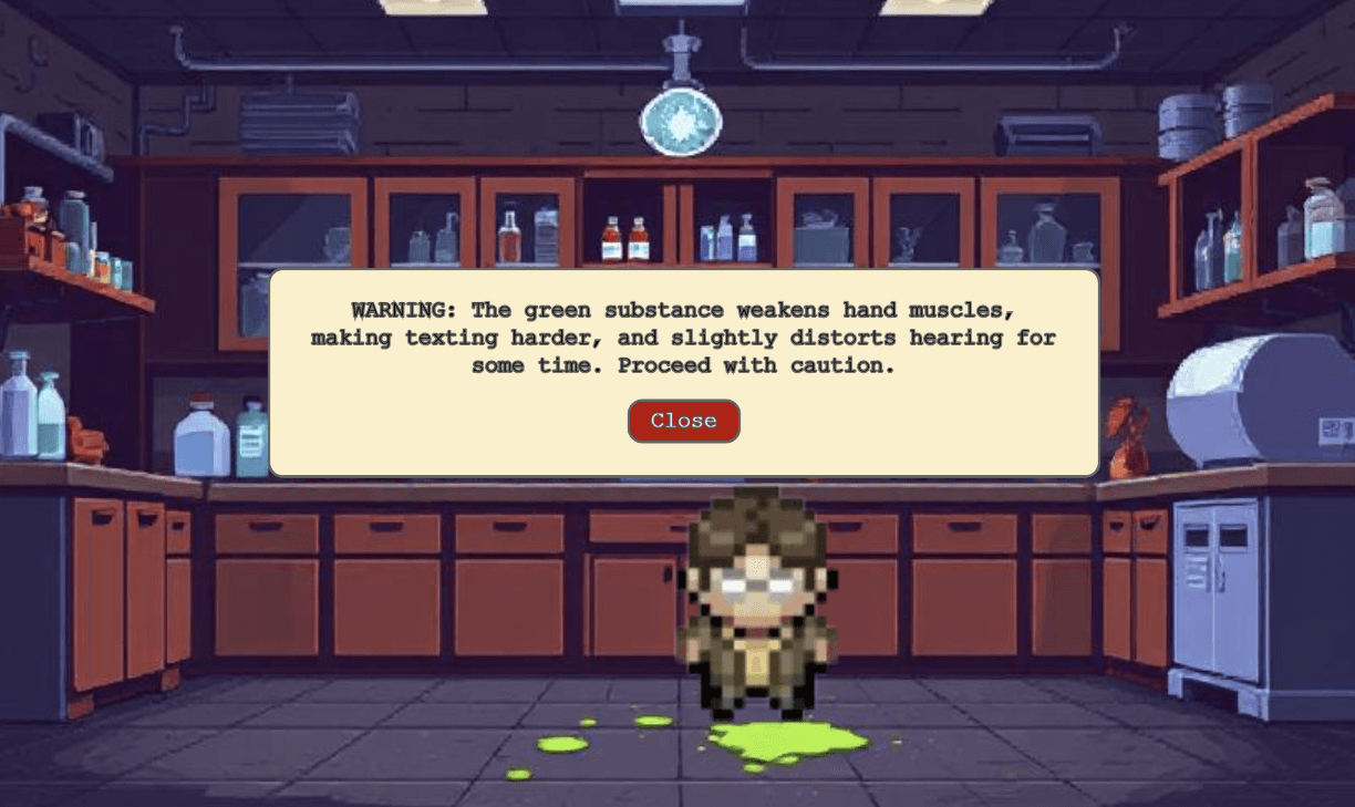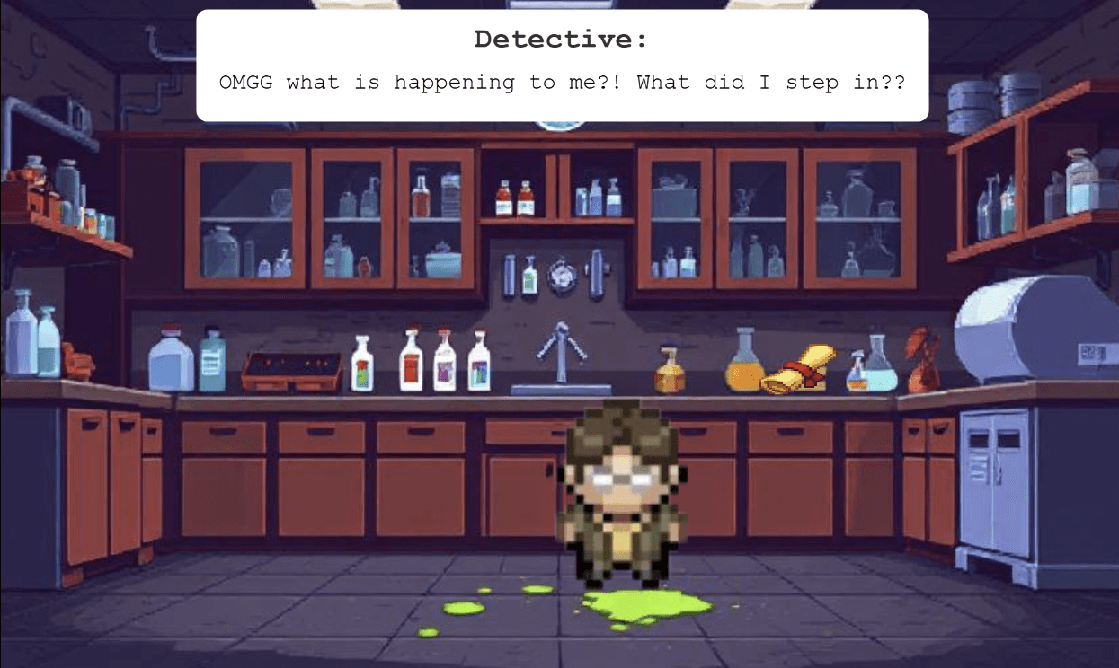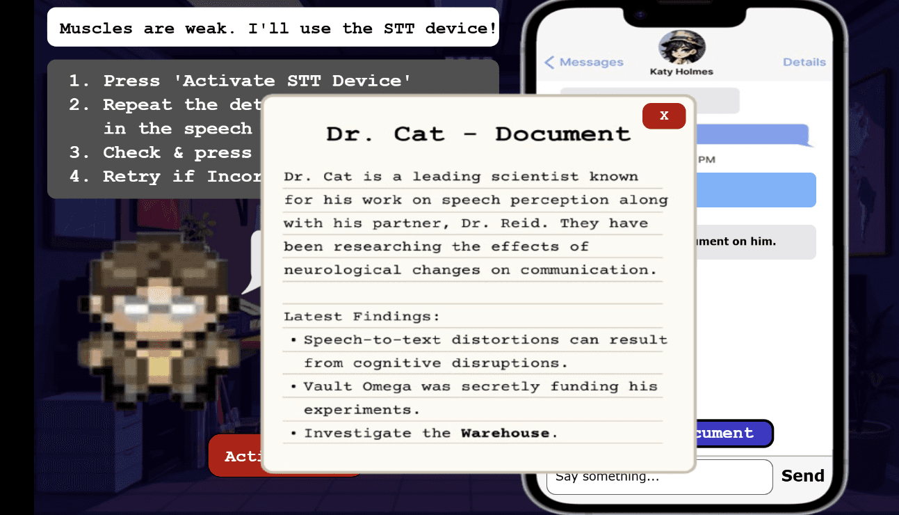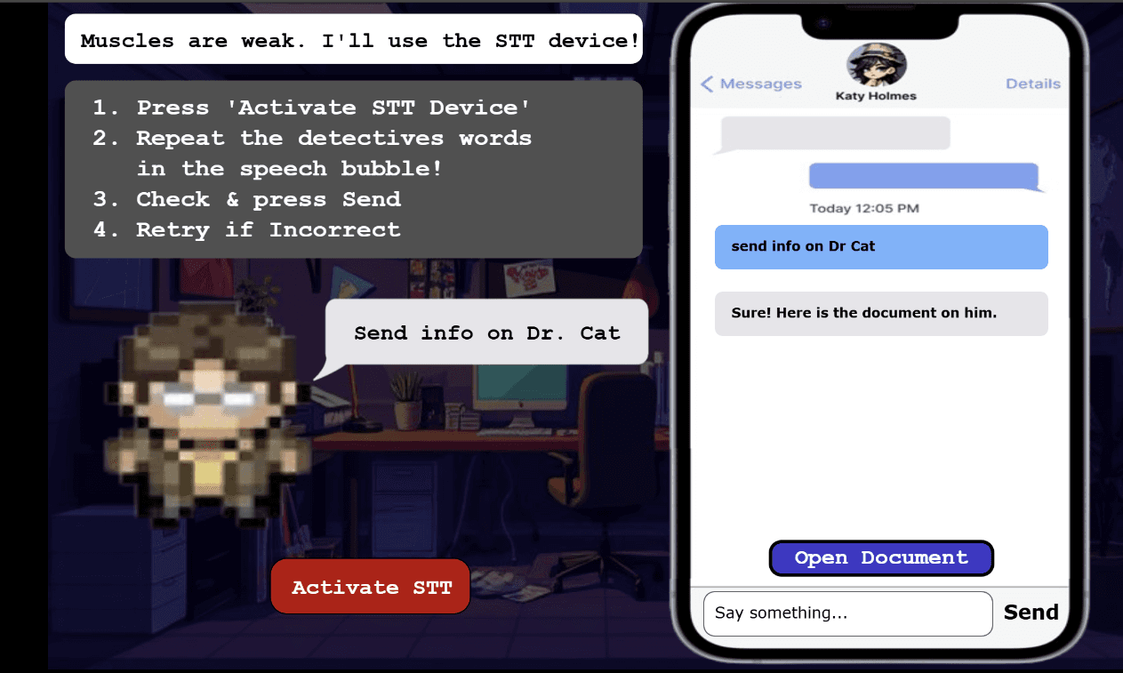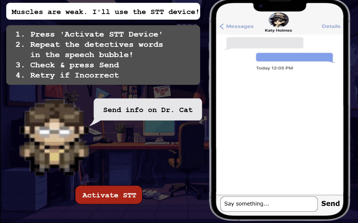 Created a detective mystery where players experience STT challenges firsthand. Detective steps in green substance that simulates speech processing difficulties, forcing reliance on STT device to solve the case and rescue missing scientist.