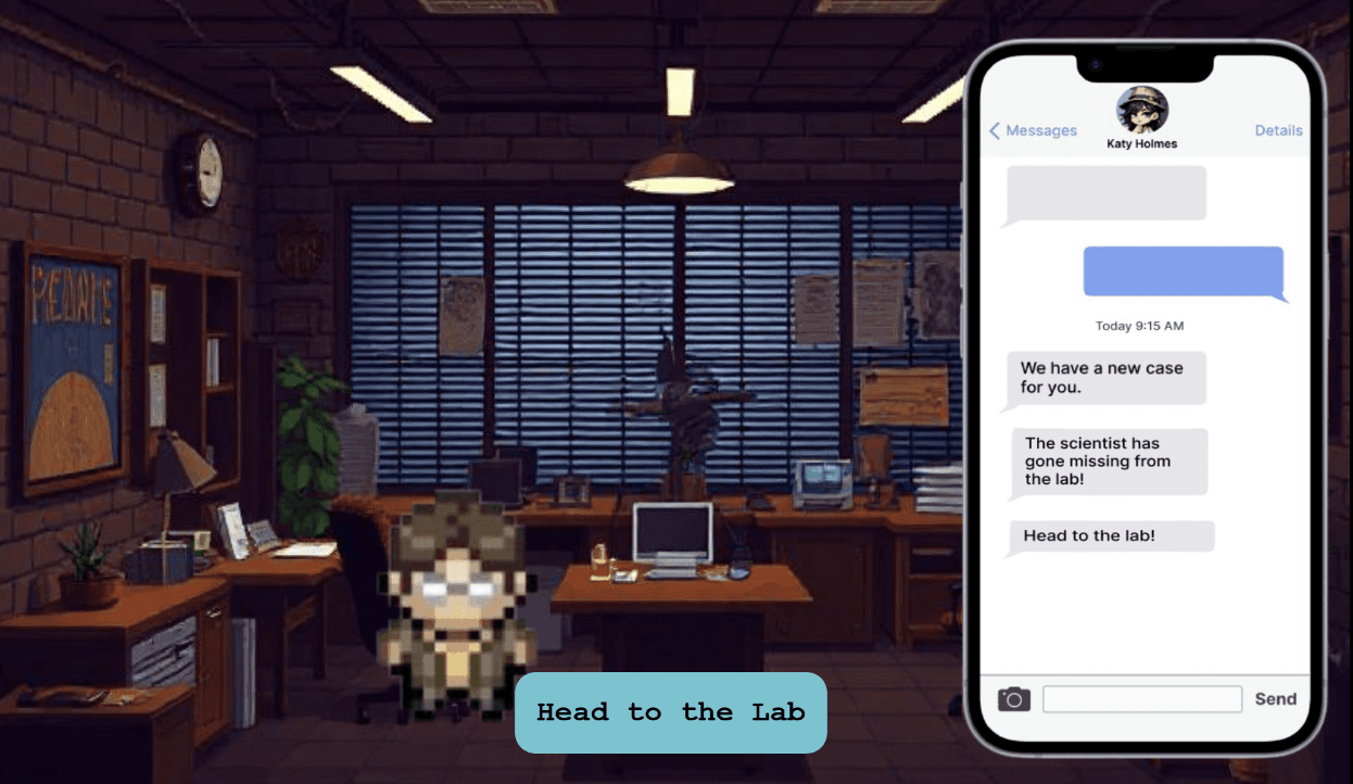 The detective begins in his office. A message appears from his boss with an urgent mission: a missing scientist with critical secrets. This scene uses a text messaging UI to build narrative immersion.